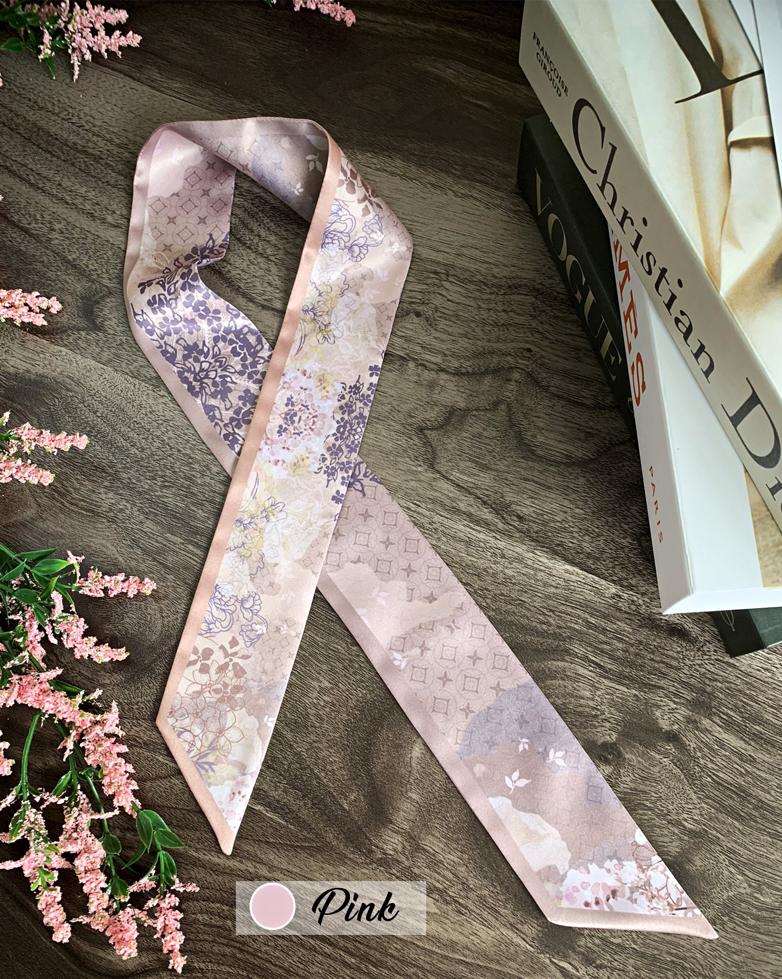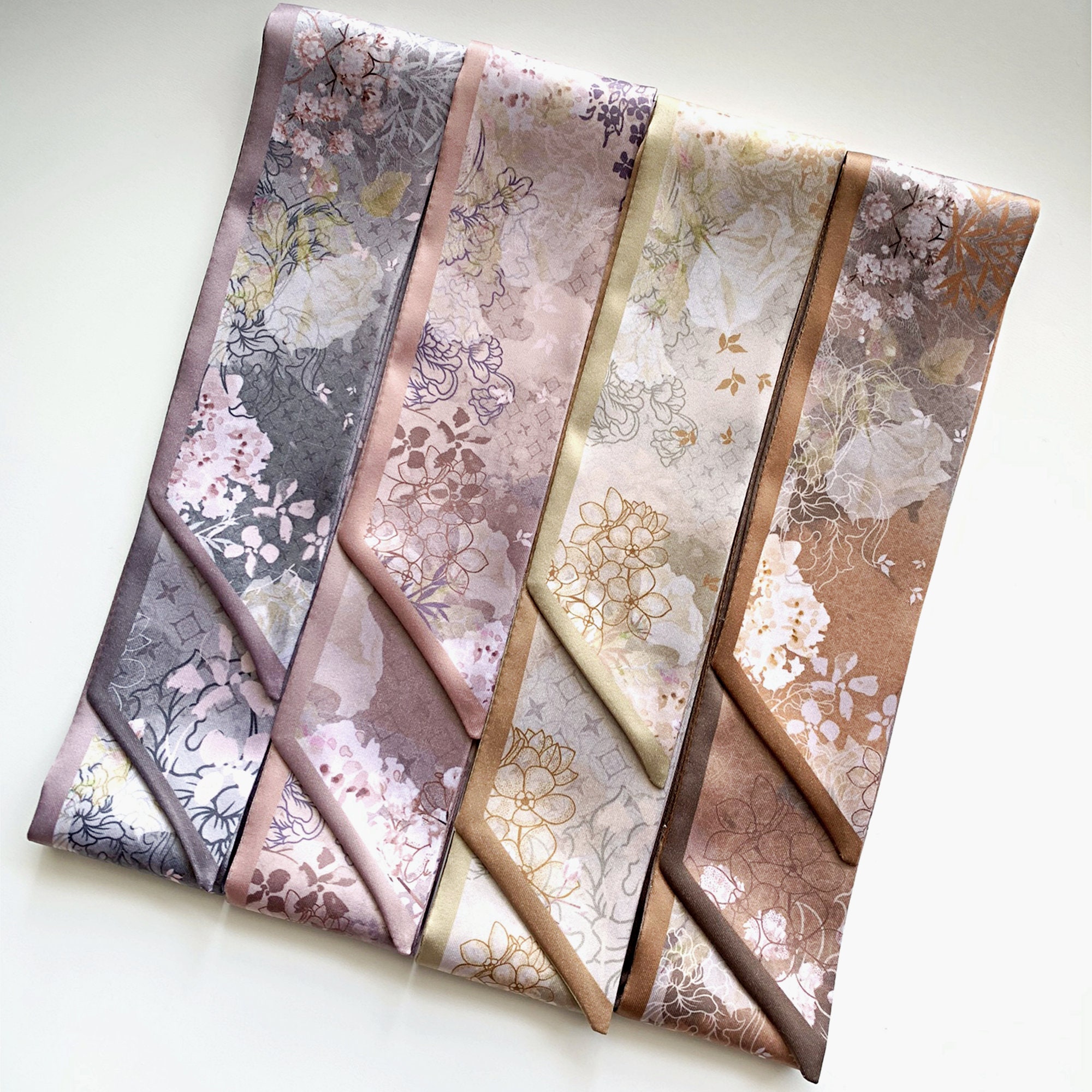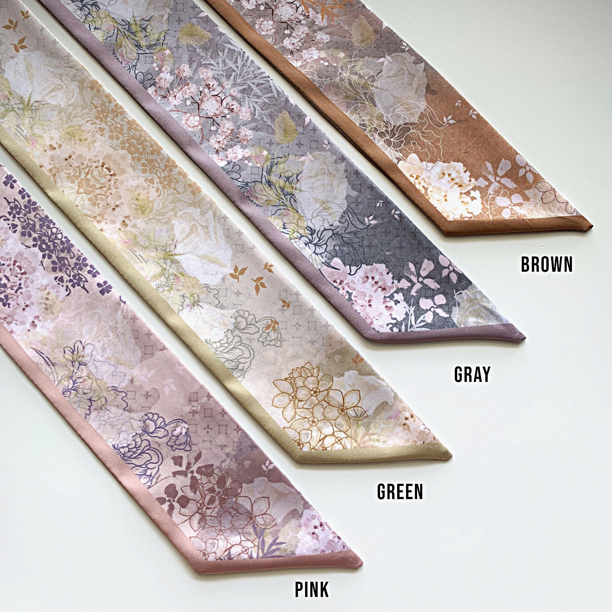 ▶For personalized products or if the motif you'd like is out of stock, you can place a preorder here: https://twillya.etsy.com/listing/1356622790/personalized-floral-handbag-scarf-satin.
